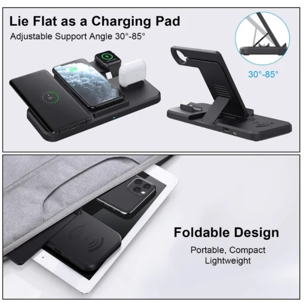 - Adjustable and folding stand: wireless charger charging pad is adjustable with 6 speeds and can be folded to take with you. There is also an additional USB port that allows you to charge the device, which is not a Qi-device. And wireless charging area has been specially designed for AirPods Pro; wireless charging station also have a rubber ring at the top and bottom, hides the cable of iWatch neatly inside, saves space on your desk.